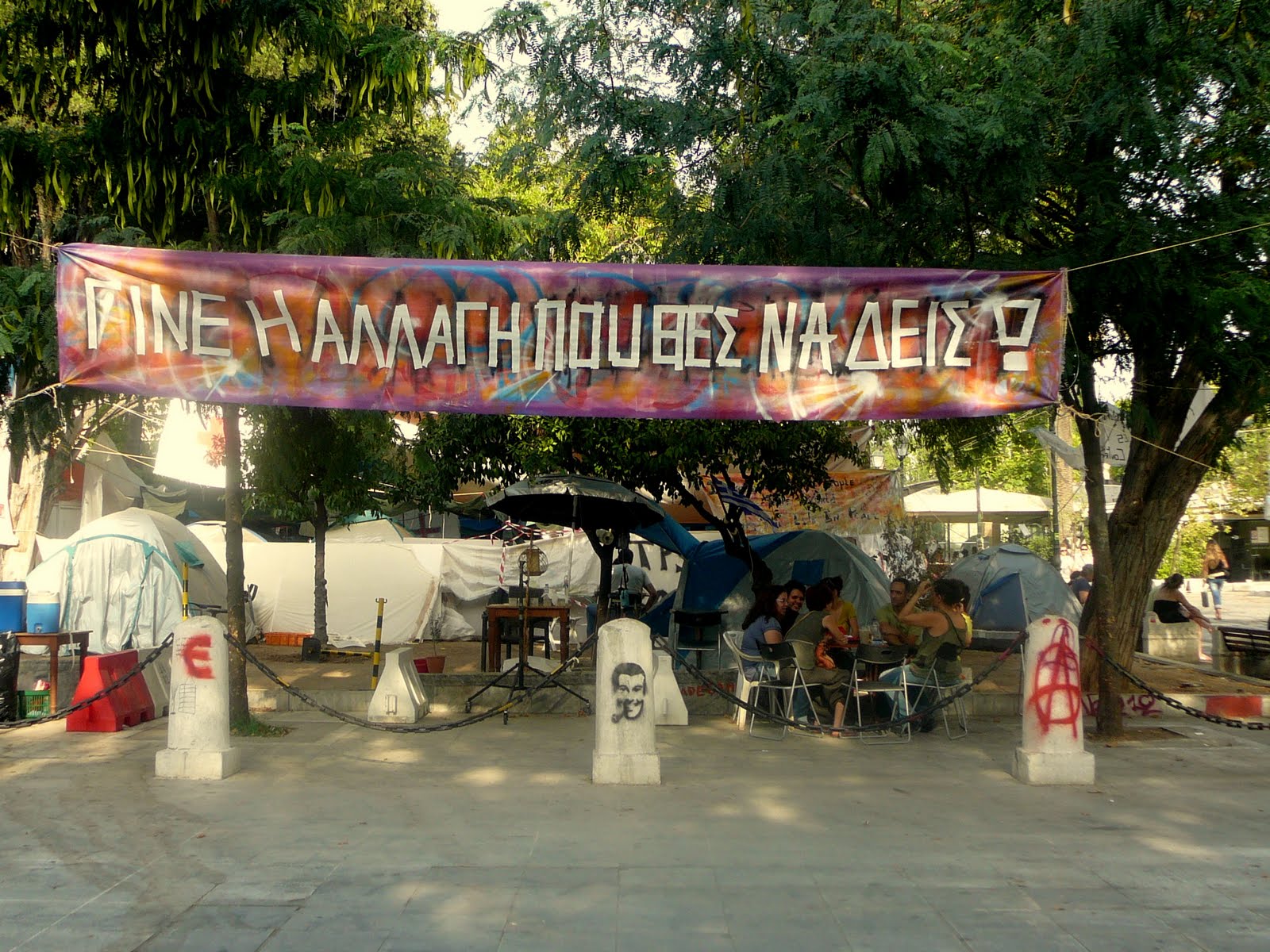 Protesters that have set up camp in the Square. Banner: "Be the change that you want to see" |